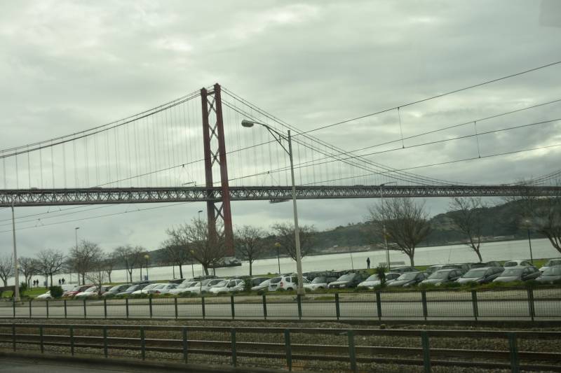 Een grote brug over de rivier de Taag verbind beide oevers met elkaar. De brug is een treinverbinding met daarboven een autobaan. Op de foto zijn rijdende auto's te zien, op het deel daaronder rijden treinen.