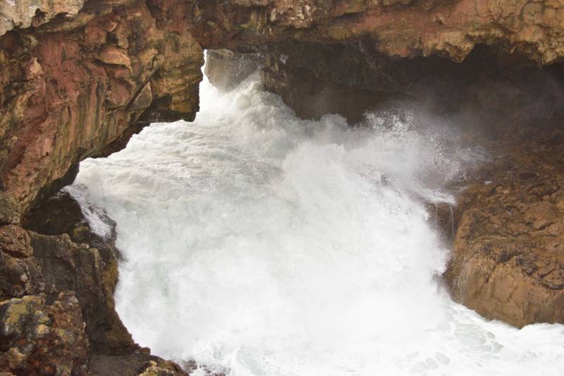 Op deze plaats heeft de zee een soort holle doorgang gemaakt waardoor het water met woest geweld naar binnen stroomt.