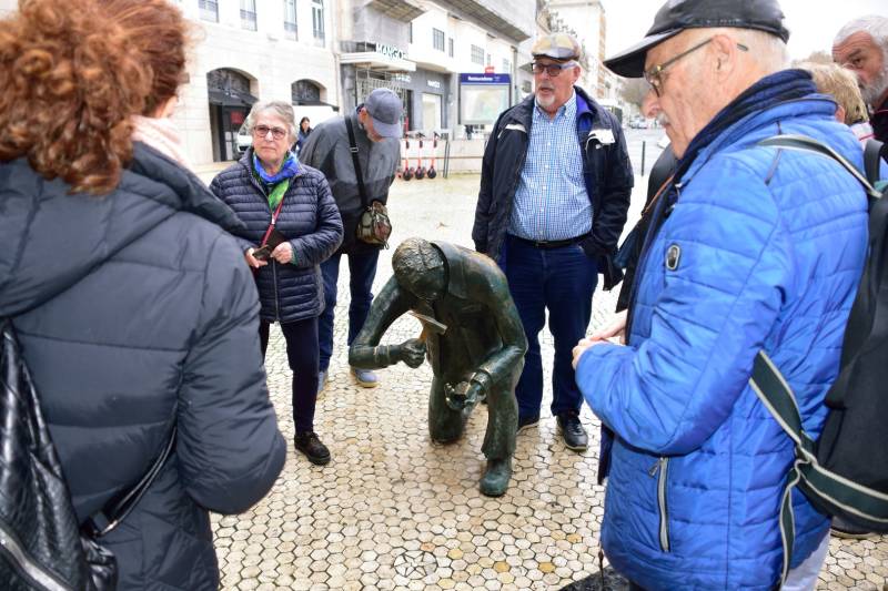 Op onze excursie naar Lissabon zijn we vergezeld door een heel enthousiaste Portugese gids of reisbegeleidster, Fatima Matheus. Ze vertelde dat door heel Portugal bijna alle trottoirs en voetpaden zijn gelegd in mozaïek. Voor dames met naaldhakken ziet het meest ideale pad maar wel heel mooi. Op de foto's is te zien hoe Fatima dit aan ons uitlegt bij een standbeeld van een mozaïek werker. Ook de wereldbol is in mozaïek gelegd en Linda toont trots waar Brazilië ligt.