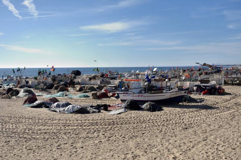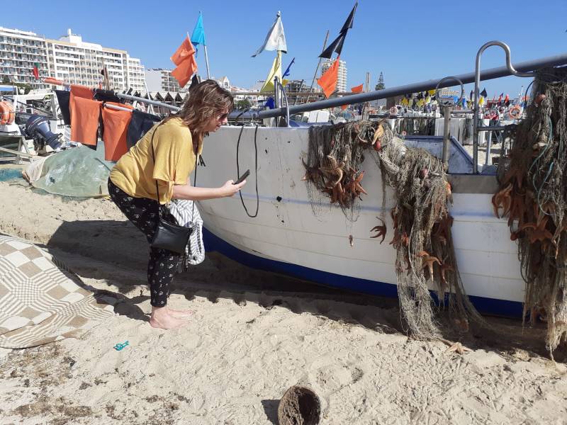 Langs het hele strand van Monte Gordo ligt een houten loop promenade. Het is prettig om daar over te lopen. Je kunt dan een heel eind lopen en ondertussen de diverse restaurant bezoeken voor een lekker kopje koffie of een koel glas bier. Daarom dat ik deze foto's stuur. Als de vissersboten terug komen met hun vangst worden ze eerst het strand opgetrokken. Dan wordt de vangst gelost. Op dat moment komen er honderden zeemeeuwen aanvliegen om ook een graantje mee te pikken. Daarna gaan de vissers eerst de netten ontwarren en schoonmaken en dan klaarleggen voor de volgende visvangst. Vanochtend langs het strand gewandeld. Een vissersboot kwam net terug van het vissen en werd door een tractor het land opgetrokken.