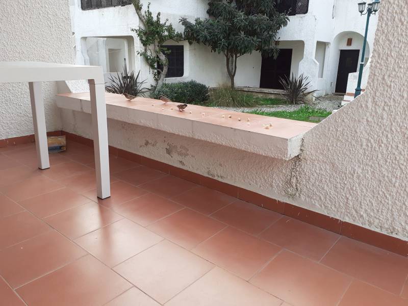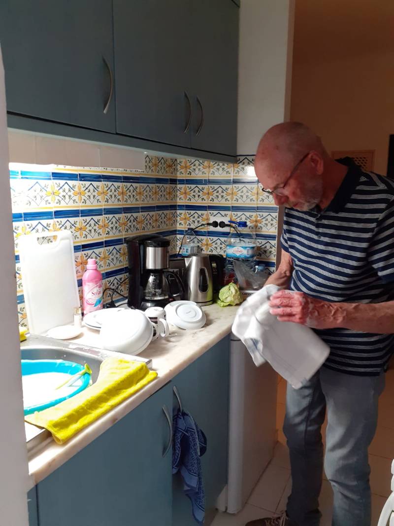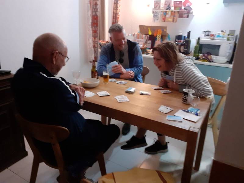 29 Feb. voor het eerst vanmorgen geen zon! Dat is vreemd. Maar wel 'n mooie tuin! Foto gemaakt vanaf het dakterras. Jan aan z'n eigen was aan het wassen, maar wel in een mooie keuken, met mooie Portugese tegeltjes. De onderbroeken waren aan de waslijn net droog toen het begon te regenen, de eerste keer sinds dat wij hier in Cabanas zijn. En ik dus maar de schelpen van gister gewassen. Ja en dan bijna elke dag 'n potje duuzende, of nog een eind aan de dag breien, dat worden dan, voor als we weer in het koude Holland zijn, eierwarmers, zodat onze gekookte eitjes lekker warm blijven. En ge ziet wel wie de grote winnaar is hè, schuppe vrouw en nog mar inne kaart in m'n hand! Zo dit was dan alweer de laatste dag van februari. Nog 4 dagen in Maart in Portugal en dan zit het er weer op .