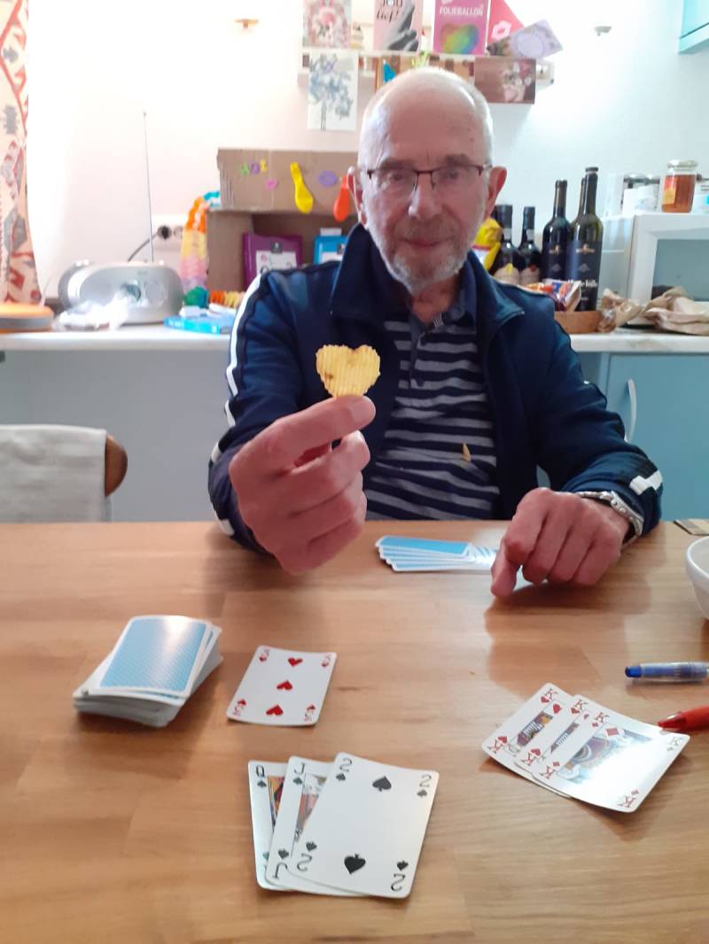 We zaten net te kaarten en toen vond Jan 'n hartjes chipje in de chips bak . Speciaal voor Ruben 'n foto gemaakt , die ziet heel vaak ergens hartjes ♥♥
