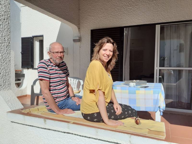 Hoi Toon even nog wat foto's van 14 Feb. samen met Wendy en Marco, en dan zijn ze er, helemaal blij dat ze in de zon kunnen zitten. Op de tafel de schelpen die ik nog in Monte Gordo gevonden had, heerlijk genieten vader en dochter van de zon, heel veel zeesterren in de netten van de vissersbootjes.