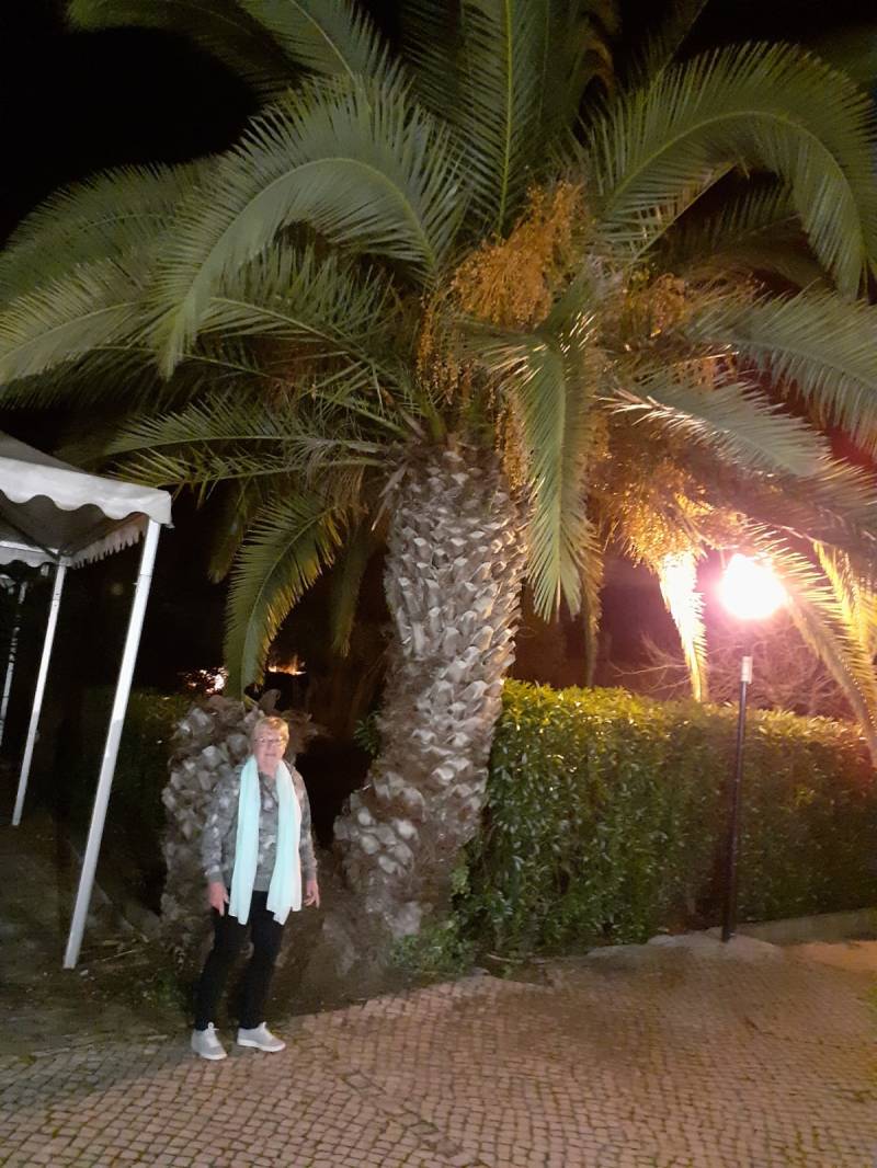 Dus na de wedstrijd PSV- Feyenoord 1-1, zijn Jip en Janneke lekker gaan eten, bij Jolly Sailer in Cabanas leuk restaurant en heerlijk! En heerlijk vinho tinto, Lekker gamba's in curry saus, en Jip kip stroganof, ja en cash betalen en dat viel reuze mee. En bij het plein bij het restaurant moest ik toch even poseren bij die prachtige palm