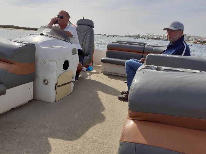 Dit was 5 Feb. het uitchecken in Monte Gordo , en dan op weg naar Cabanas vol goede moed ! De 20 tassen staan al in de auto en de koffers worden met de 2e rit opgehaald , vooruit met de schuit , en dan.....Houdoe !