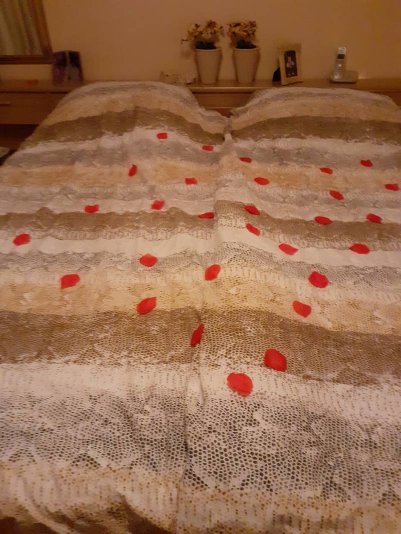 Een ontbijttafel voor morgenvroeg met veel lekkers, waar wij van houden en in de koelkast ook nog. Overal rozenblaadjes en kleurige slingers, een mooie bos bloemen ontbrak er ook niet , allemaal werk van Wendy, Marco, en Ruben heeft ook mee geholpen. Het huis was lekker warm, hadden ze ook voor gezorgd dat het allemaal goed werkte. Dus voldaan moe naar bed na zo'n lange dag en wat zagen we daar, Ruben had ook, in de vorm van een hart rozenblaadjes op ons bed gelegd, de schat !
