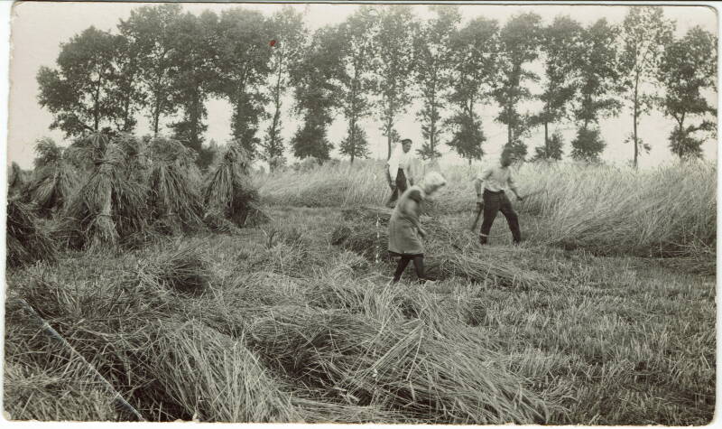 Bovenstaande foto gekregen van Tonny, op de reünie van 23 oktober 2022, dochter van ome Bertus en tante Dina, en vertelde daarbij dat ome Bertus altijd de foto tevoorschijn haalde en trots vertelde dat dat zijn moeder was die daar koren stond te binden op het veld. Jammer dat we de namen van de mannen niet weten hé!! De voorste zou haar vader kunnen zijn: Peter Saris en met de pet op misschien opa Saris? Op dezelfde plek heb ik samen met ome Theo, lang geleden, een stuk met de zigt gemaaid omdat het plat lag van de regen, maar me nog goed herinner omdat de schoven zo zwaar waren van het water.