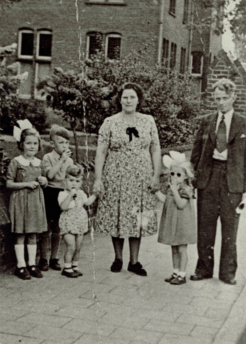 Uiteraard kwam ook ter sprake dat we een goede en uitstekend georganiseerde reünie achter de rug hadden. En natuurlijk kom je dan ook op het gegeven, dat er nog meer foto's hier en daar rond moeten slingeren om het maar eens een keer oneerbiedig te zeggen. Tonny kwam meteen met de foto links, waarop ze zelf helemaal rechts staat, met zonnebril, en ze schatte dat ze zo'n 3 jaar oud was op die foto. Van het een kwam het ander en ze vertelde dat ze ook nog foto's had van haar vaders jubileum of pensioen dat weet ik niet precies meer, maar we hebben afgesproken om een keer bij elkaar te komen en door de albums te bladeren om te kijken of er nog iets moois voor op de pagina van ome Bertus en tant Dina bijzit. Binnenkort meer hierover.