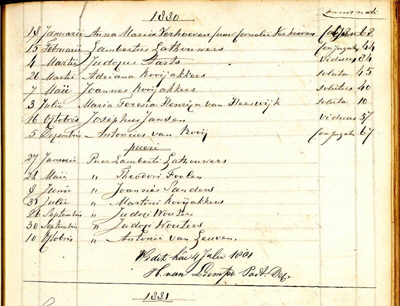 Hierboven een uittreksel uit het begraafregister (als je zelf wilt spitten dan klik op de link) van de H. Genovevakerk in 1880. Het begraafregister wordt in mijn ogen anders bijgehouden dan het geboorteregister, de overledenen worden pas na afloop van jaar in het register bijgeschreven, vandaar dat de overleden kinderen netjes onder de volwassenen genoteerd staan, dat zou normaal gesproken niet kunnen.