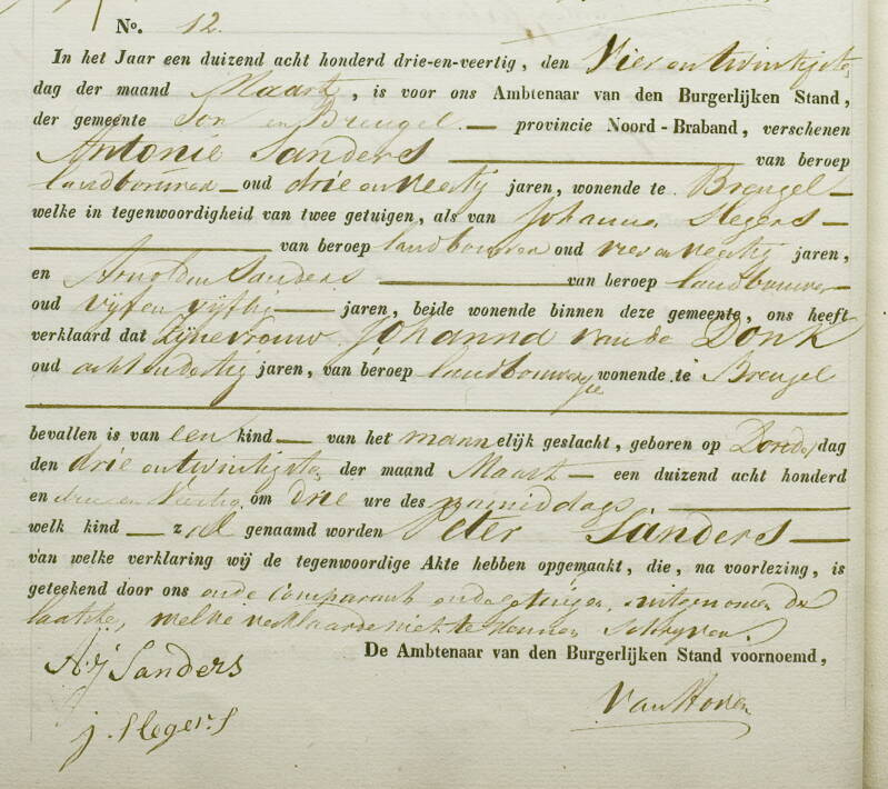 Uit het meest linkse geboorteuitreksel is te zien dat Johanna al een zoon had, Peter, geboren op 14 februari 1826 in Nuenen, en dat hij gewettigd is bij het trouwen van Antonie met Johanna op 4 november 1831.