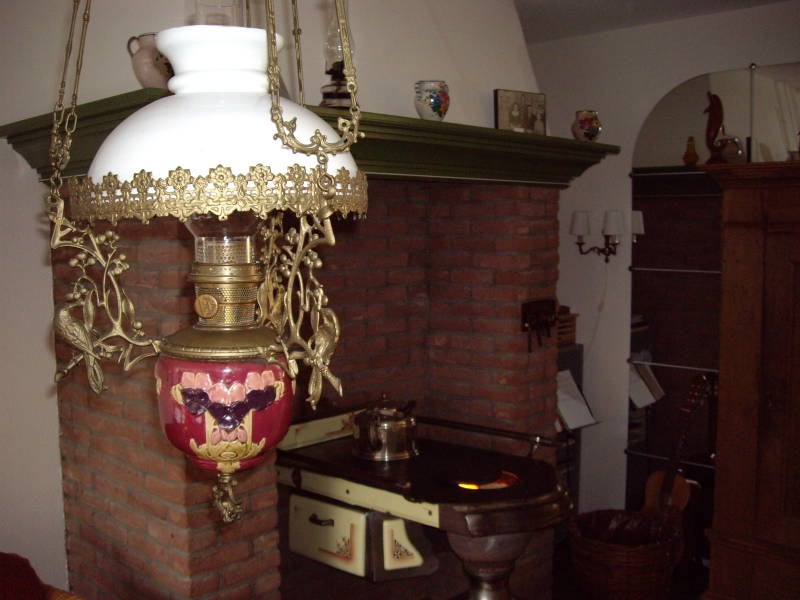 En zoals jullie op bovenstaande foto kunt zien, er zit geen stroom meer in, maar wel nog steeds de mooie stroomlijn die hij al jaren heeft. Hij is nog niet helemaal in oude luister herstelt, als alles meezit wordt het weer een gewone normale olielamp, maar ik wou hem toch aan jullie laten zien. Daar kijk ik dus naar als ik zit mijmeren bij, maar vooral, over de lamp.