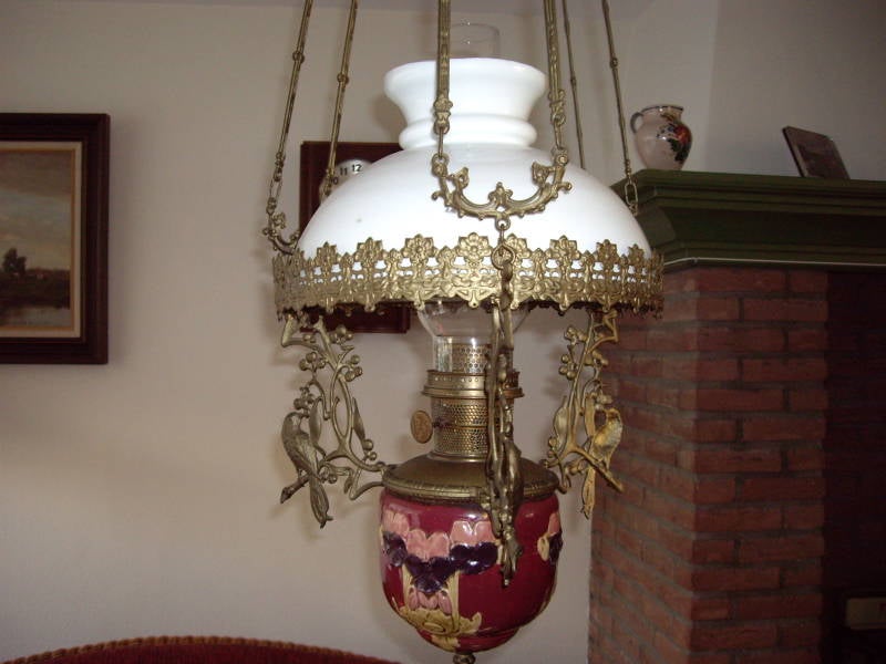 En deze lamp heeft mijn vader, voor mijn neven en nichtjes ome Toon, omgebouwd tot een elektrische. Jarenlang bij ons thuis in de huiskamer gehangen, en later nog jarenlang bij onze Jan in huis. En nu heb ik hem al weer een hele tijd, en hij begon in verval te raken. Dus niet alleen de huiskamer een grote beurt gegeven maar ook de lamp.